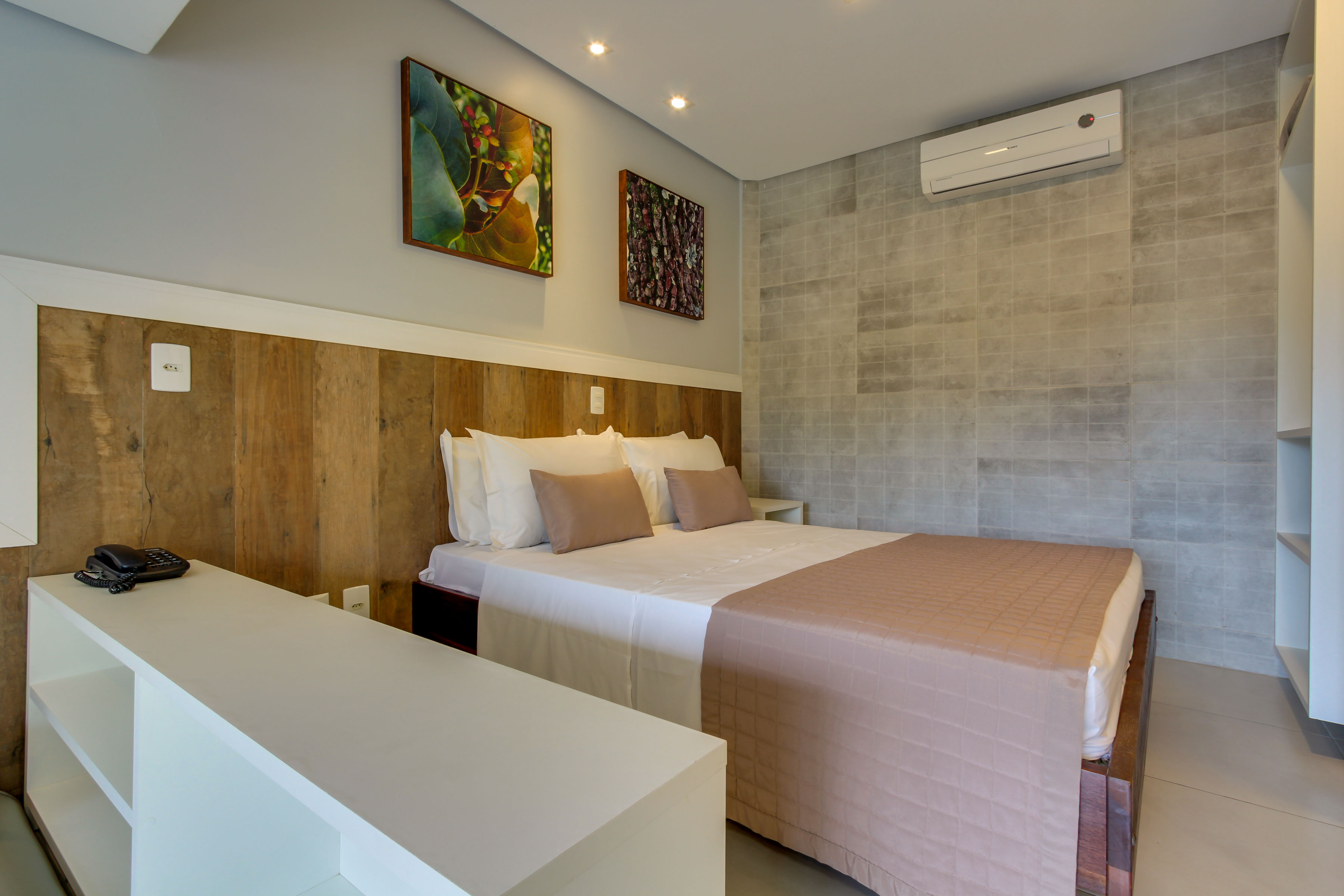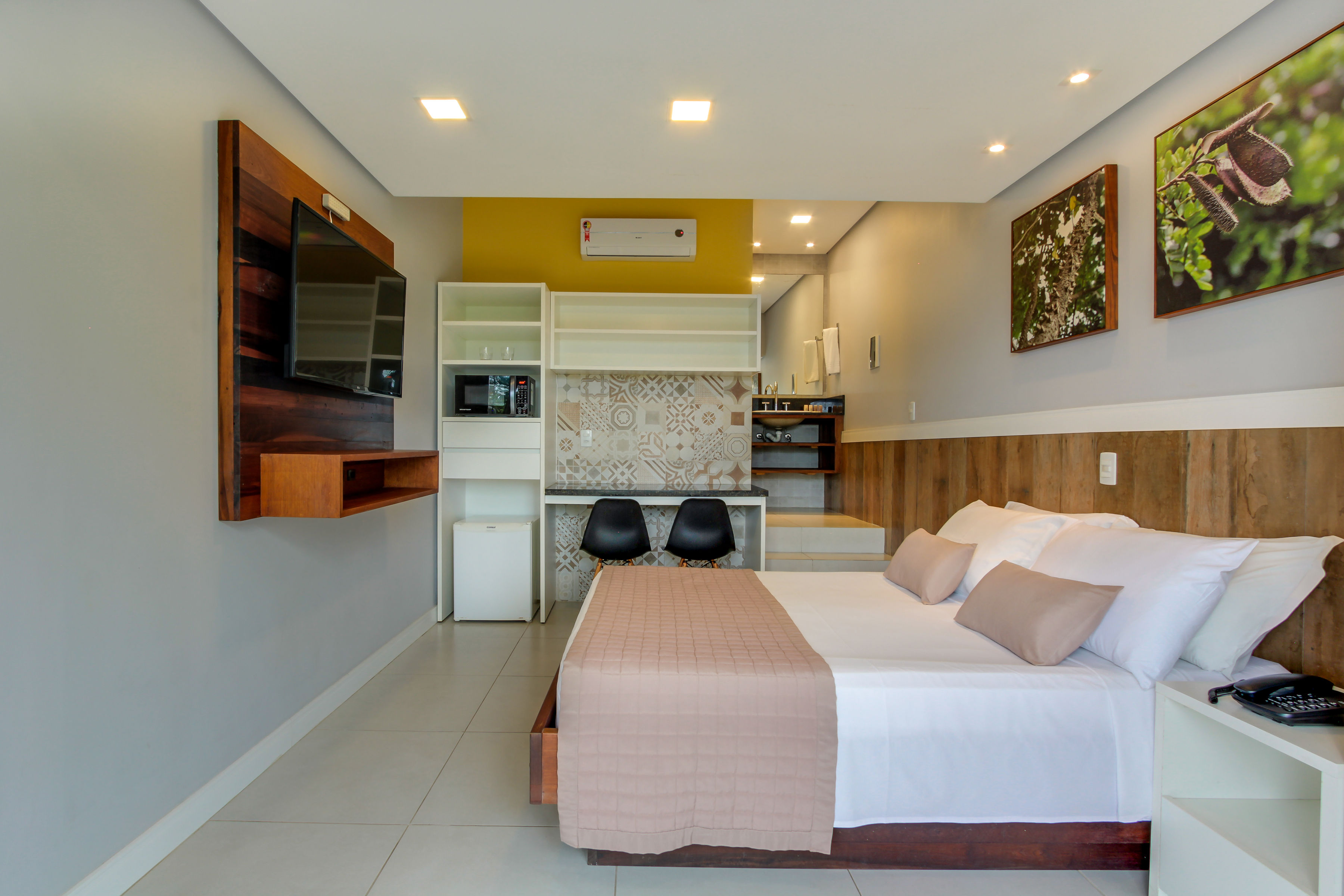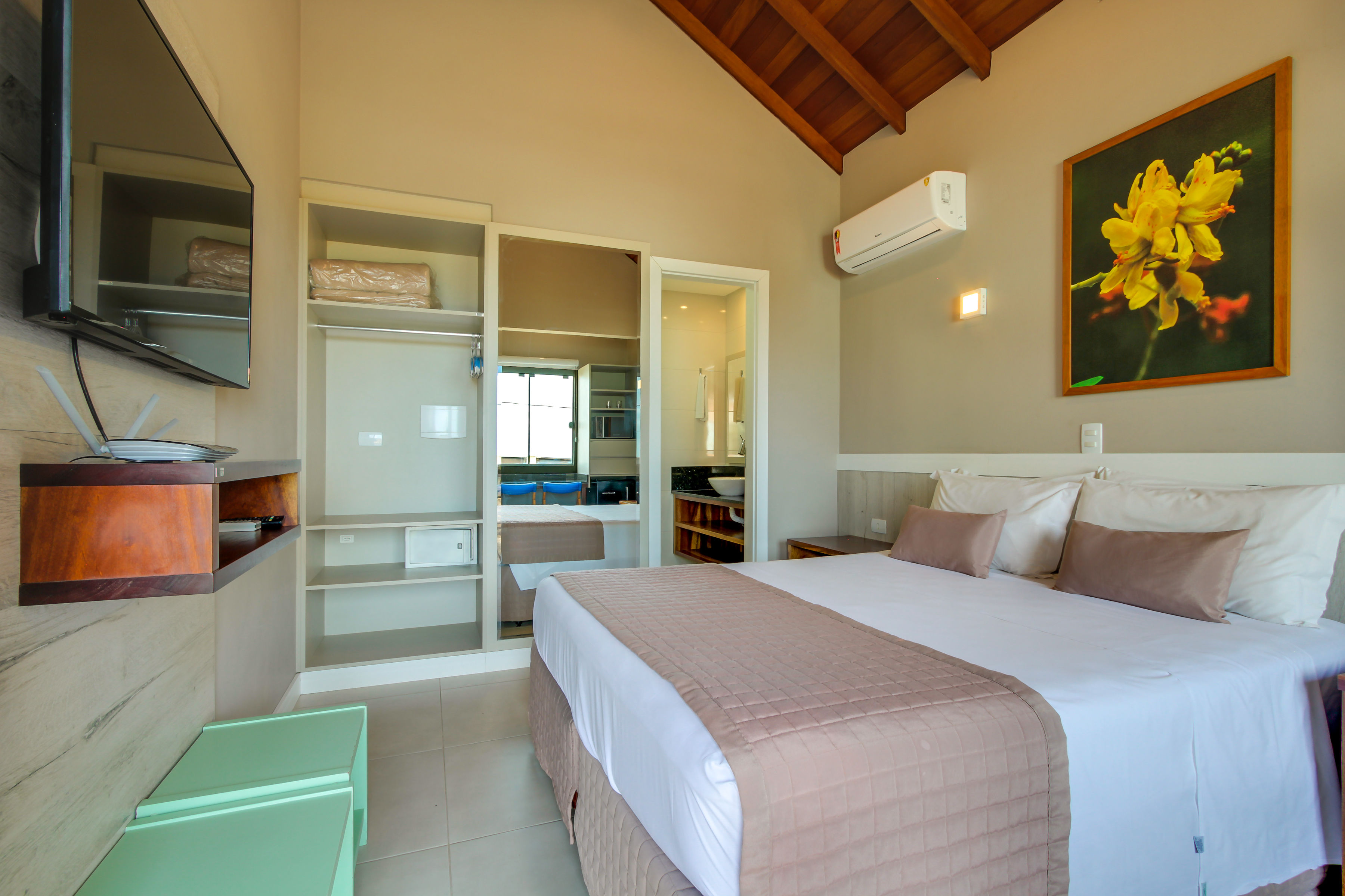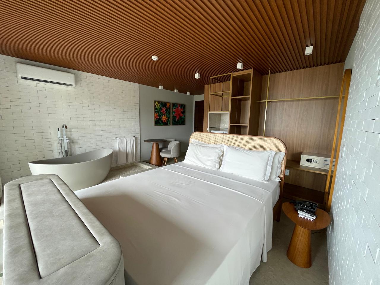 Apartamento c/ 20m² mono ambiente equipado c/ cama casal, TV 43”, ar condicionado Split, telefone, cofre digital, frigobar, microondas, bancada para refeições, banheiro privativo c/ ducha a gás e secador de cabelo