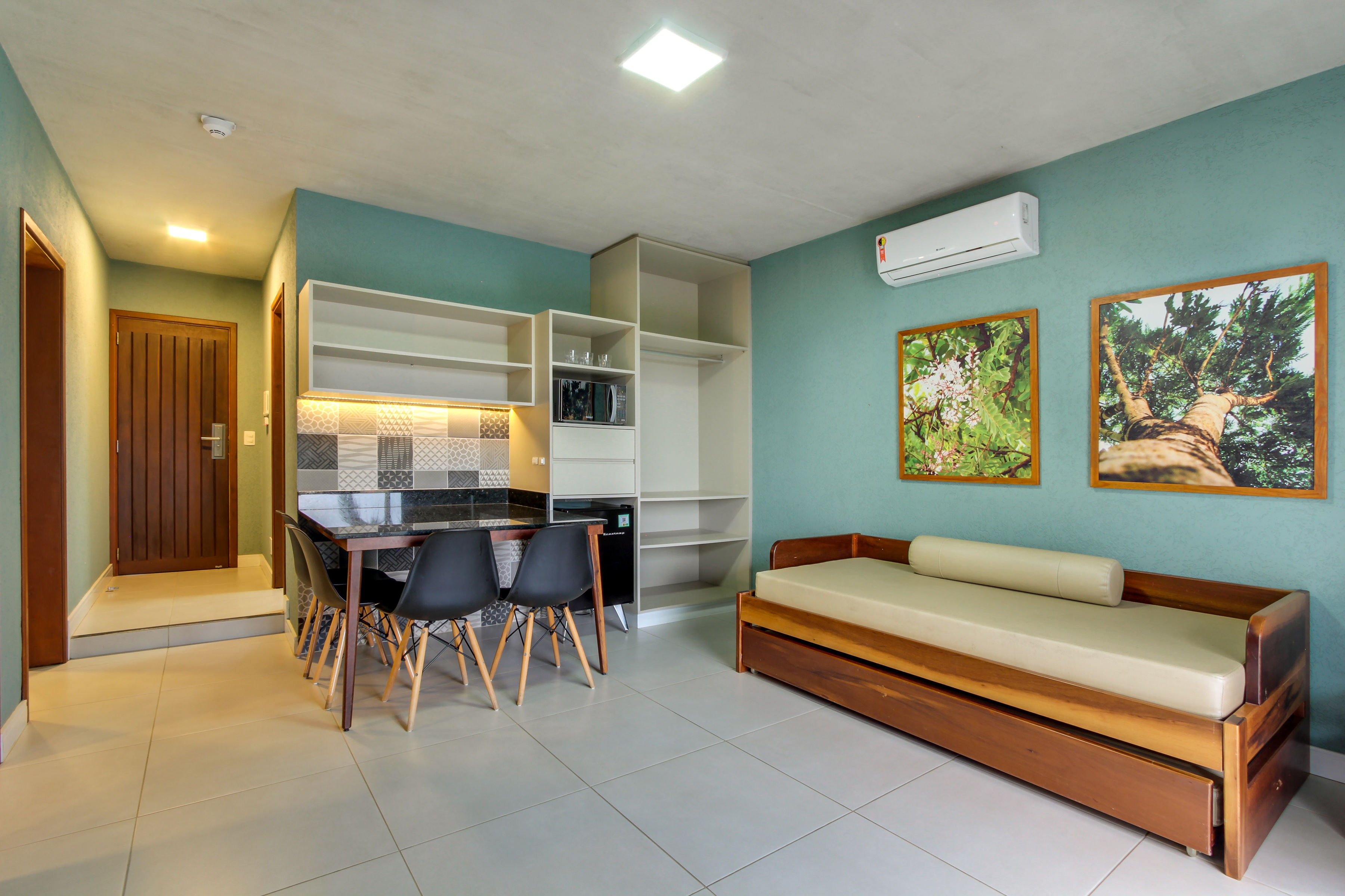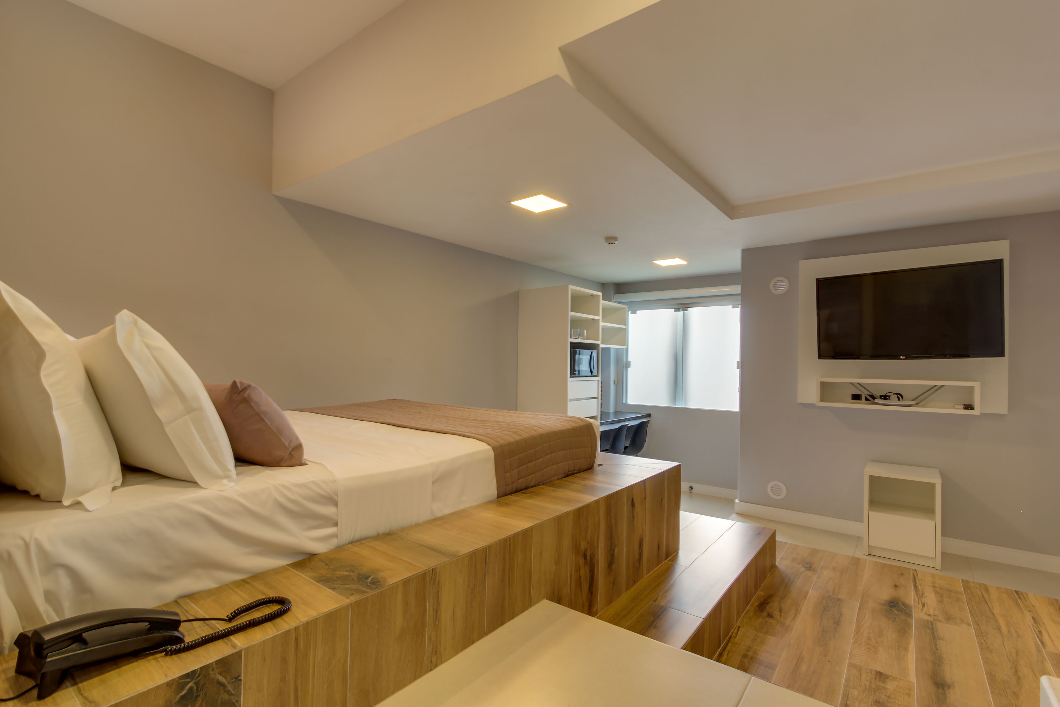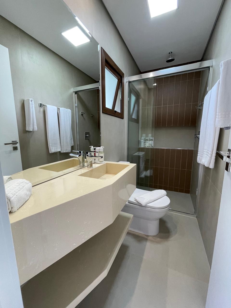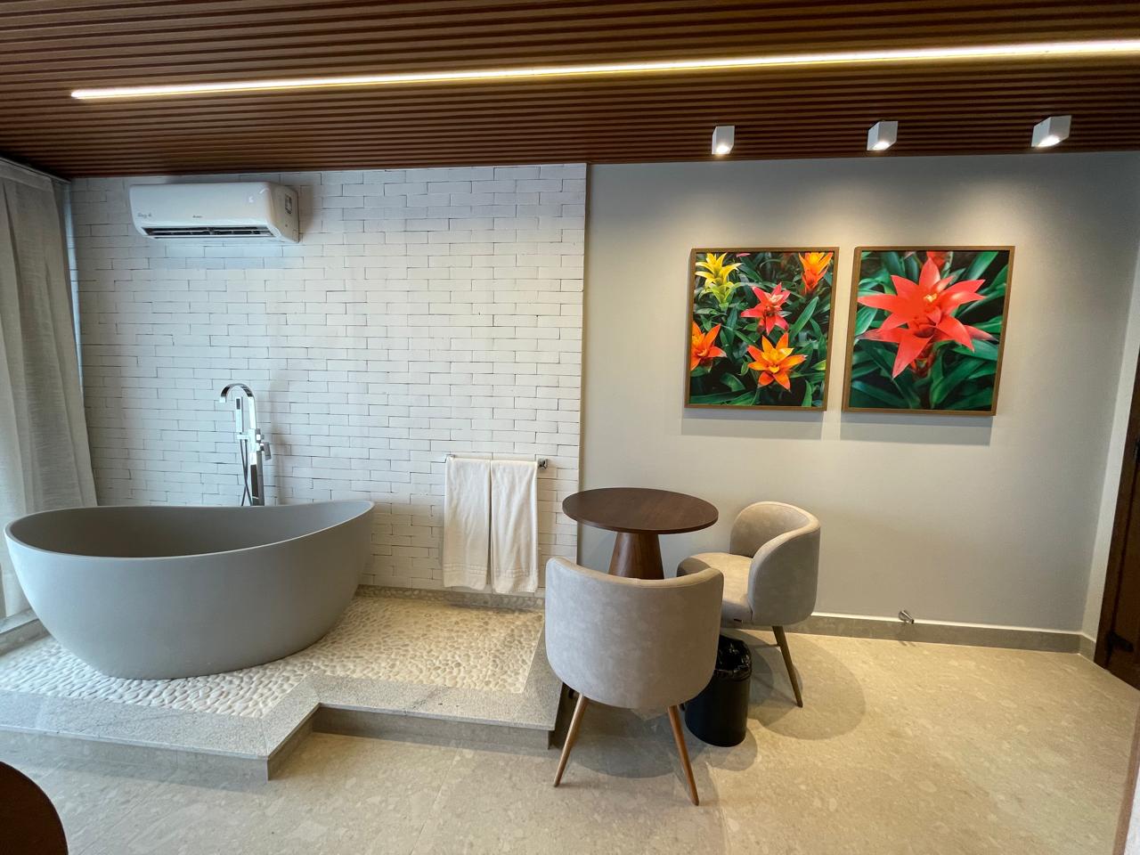 Apartamento c/ 20m² mono ambiente equipado c/ cama casal, TV 43”, ar condicionado Split, telefone, cofre digital, frigobar, microondas, bancada para refeições, banheiro privativo c/ ducha a gás e secador de cabelo