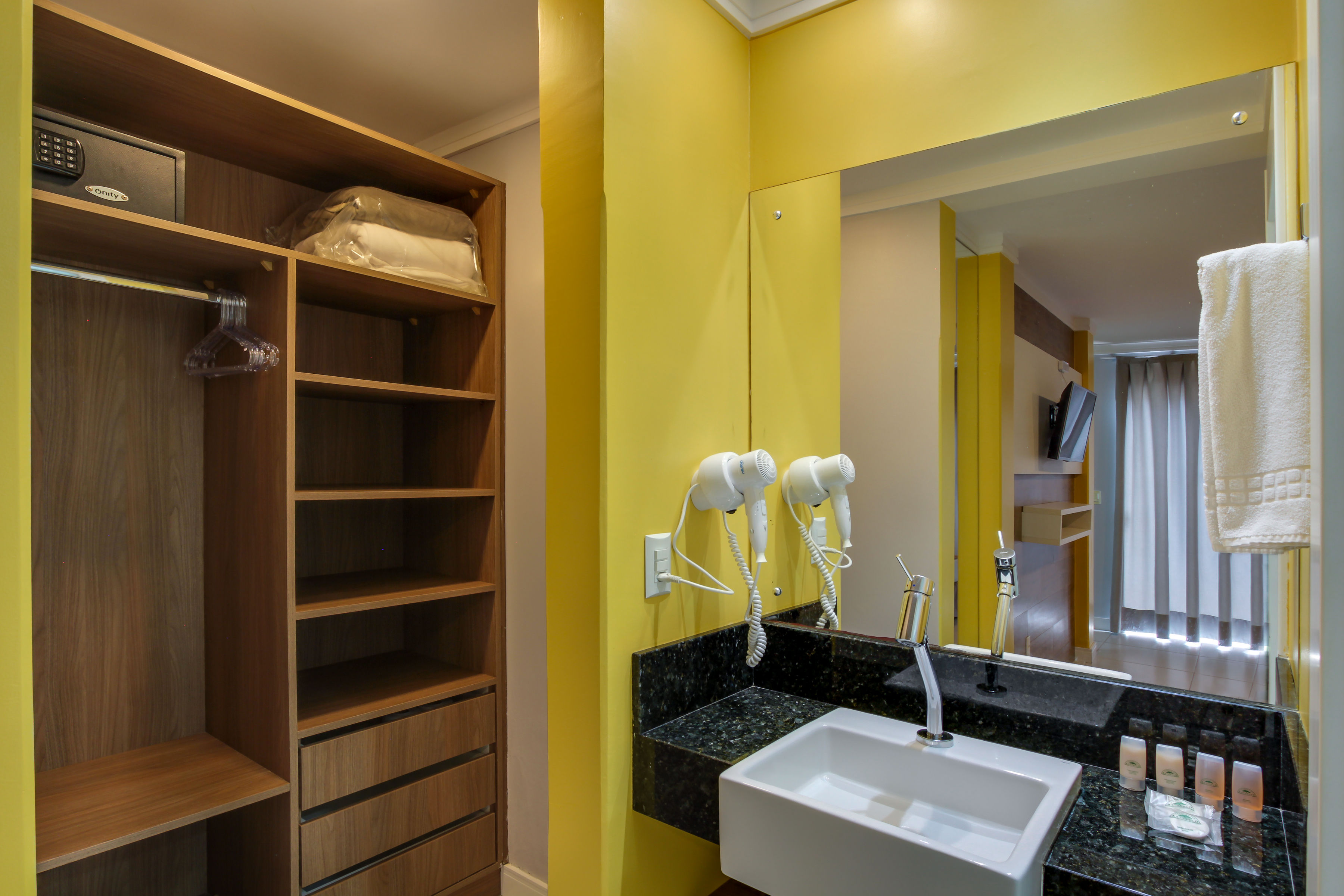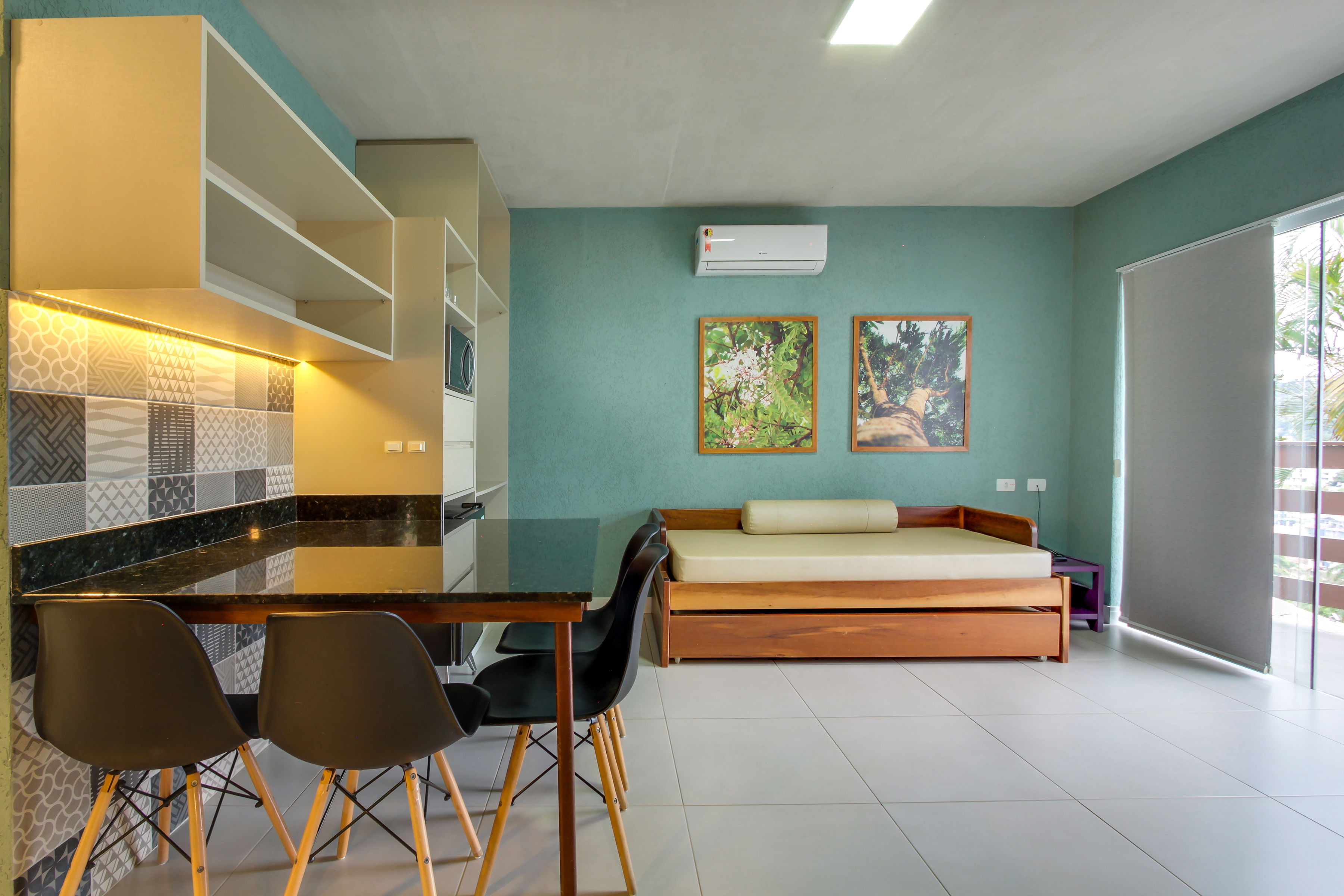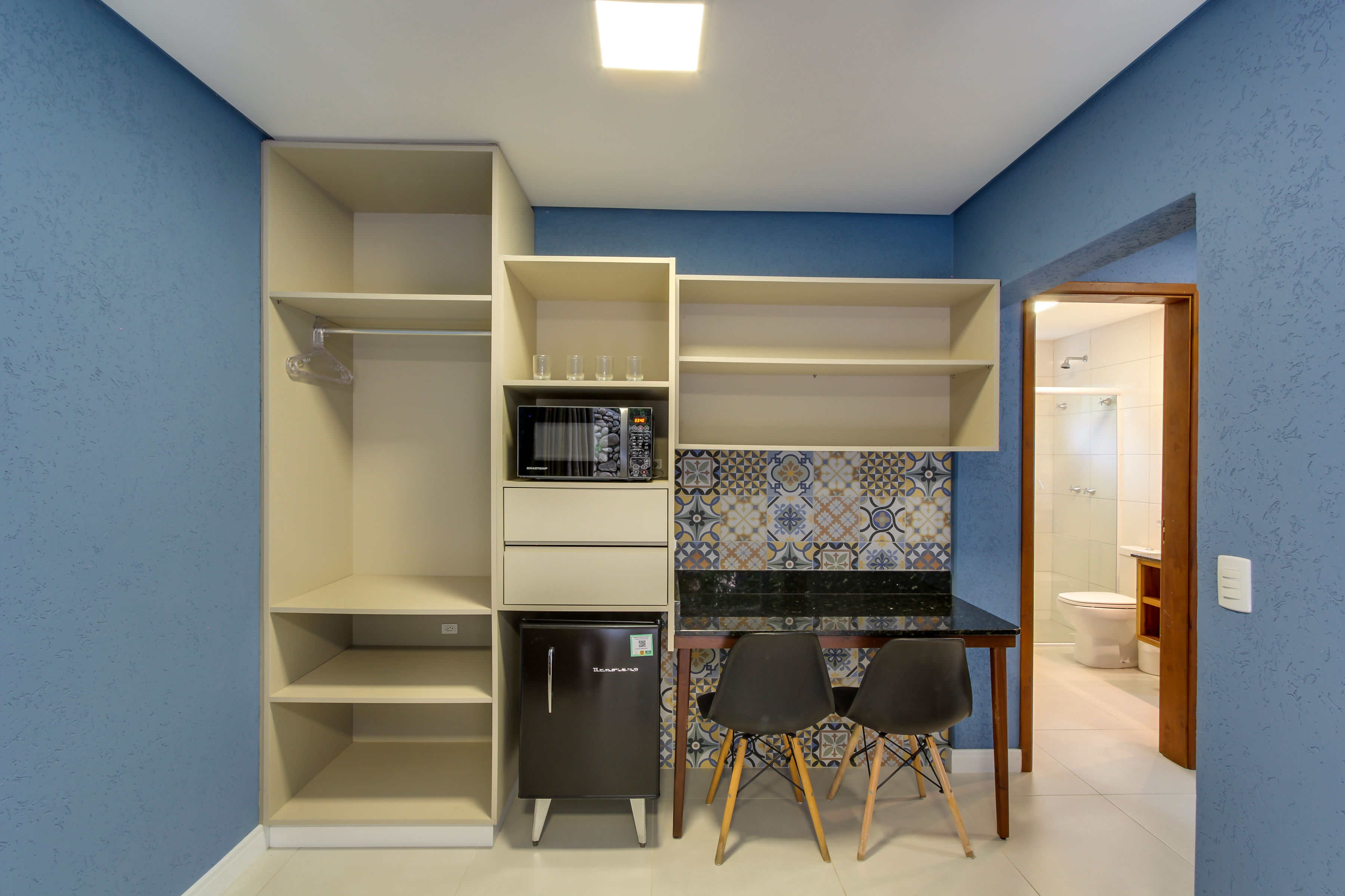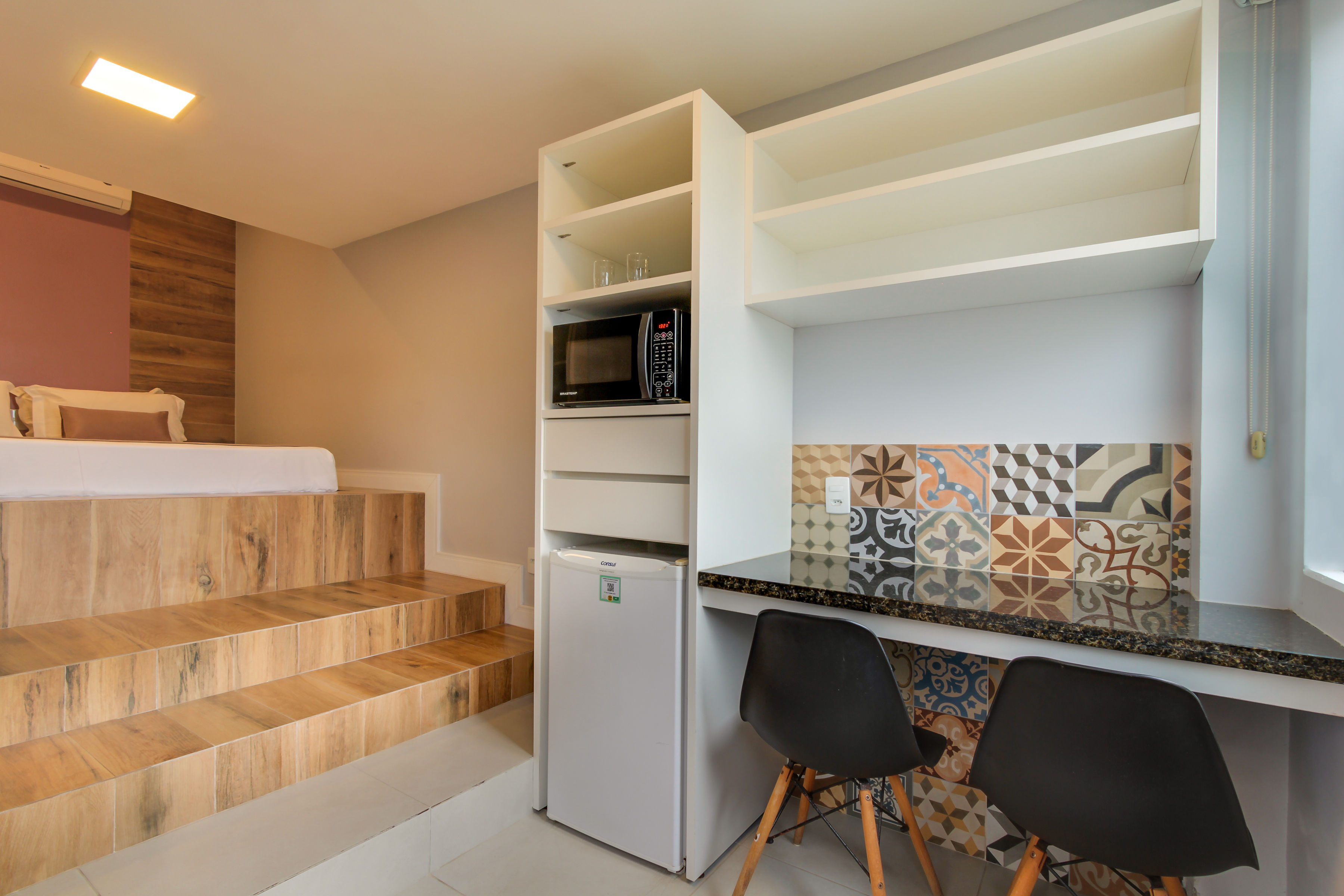 Apartamento c/ 20m² mono ambiente equipado c/ cama casal, TV 43”, ar condicionado Split, telefone, cofre digital, frigobar, microondas, bancada para refeições, banheiro privativo c/ ducha a gás e secador de cabelo