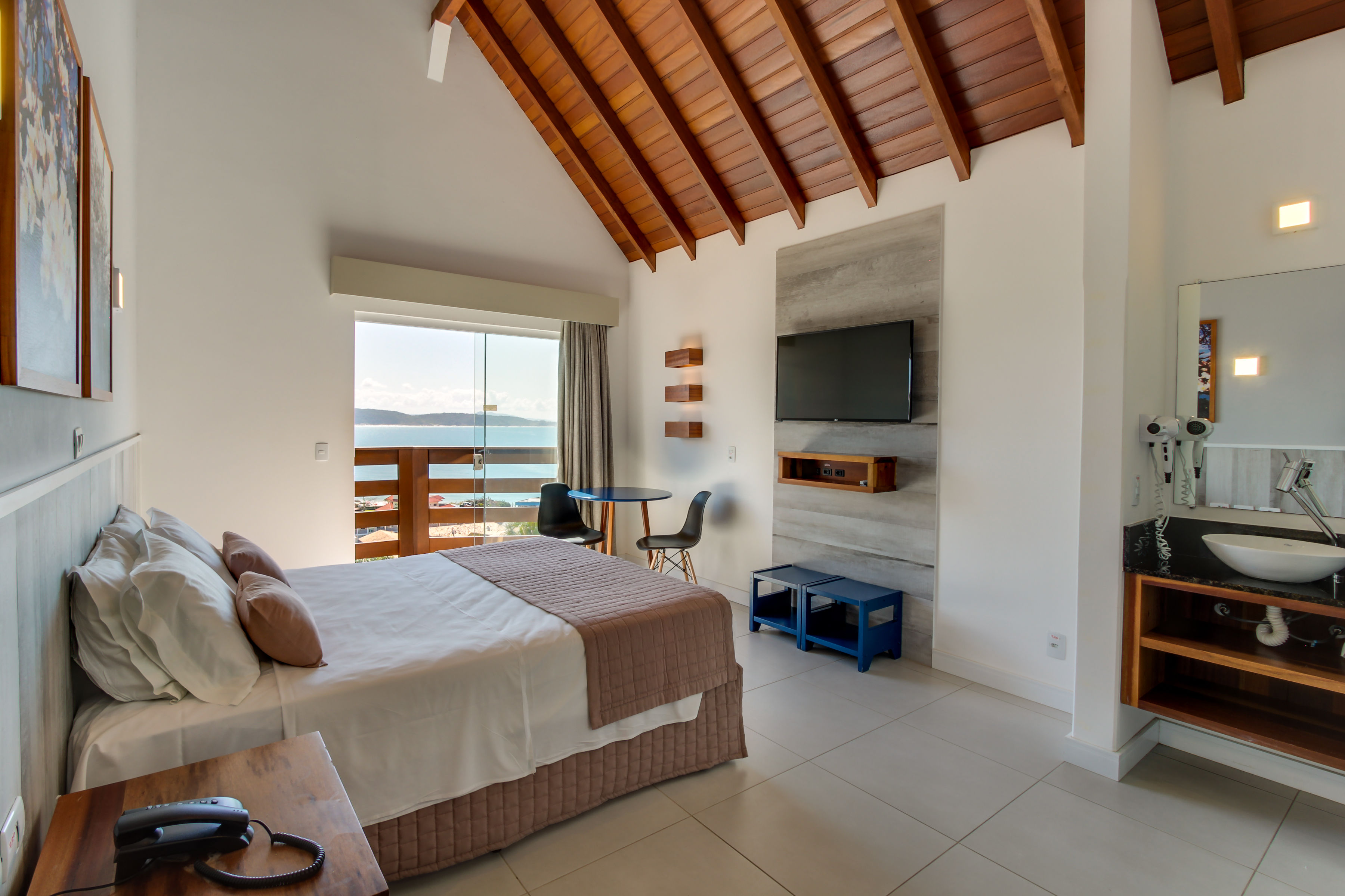 Quarto com 30m² equipado com cama de casal, TV 32”, ar-condicionado Split quente/frio, telefone, cofre manual, frigobar, micro-ondas, mesa c/ cadeiras, banheiro c/ secador de cabelo e ducha a gás, sacada com vista para o mar.