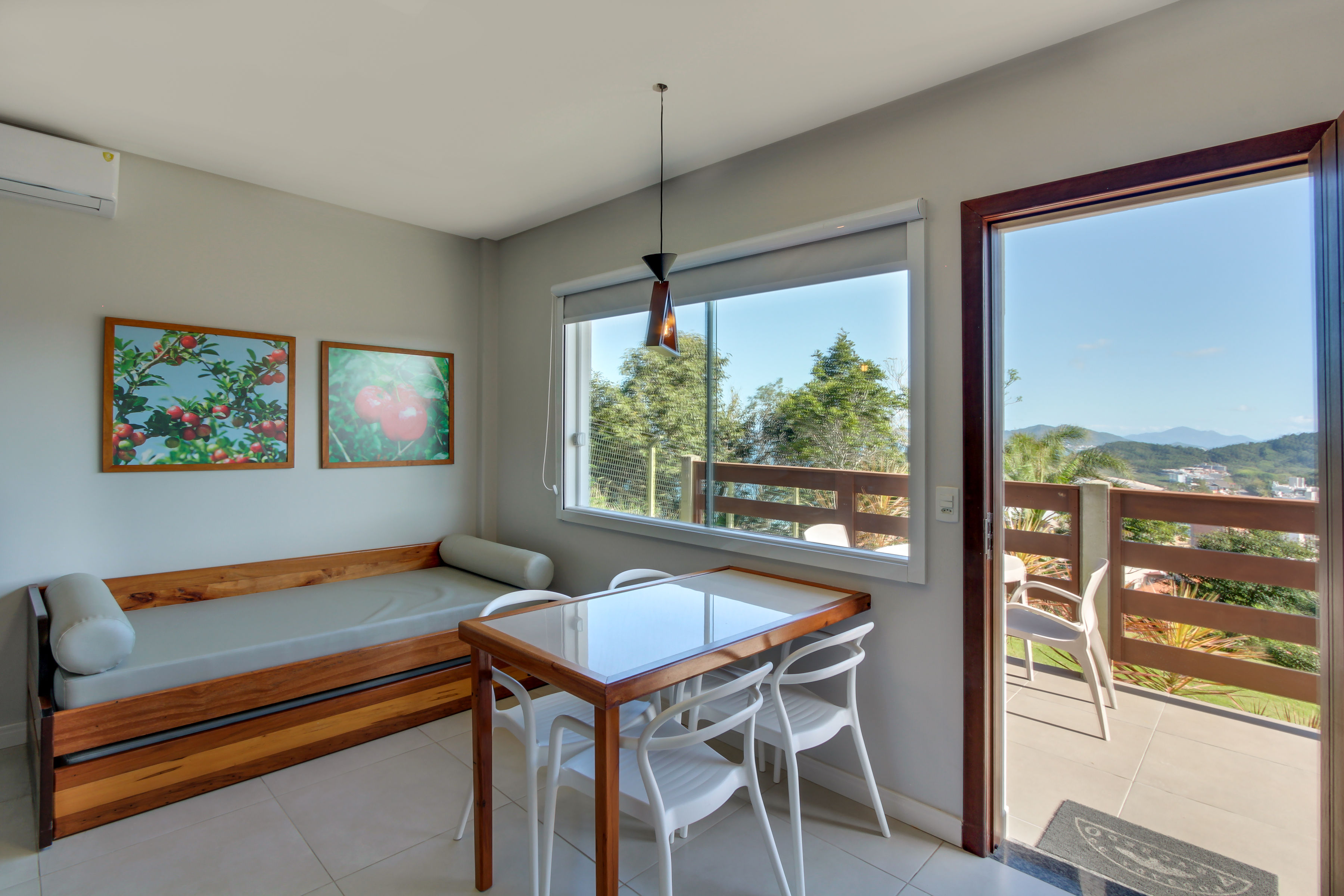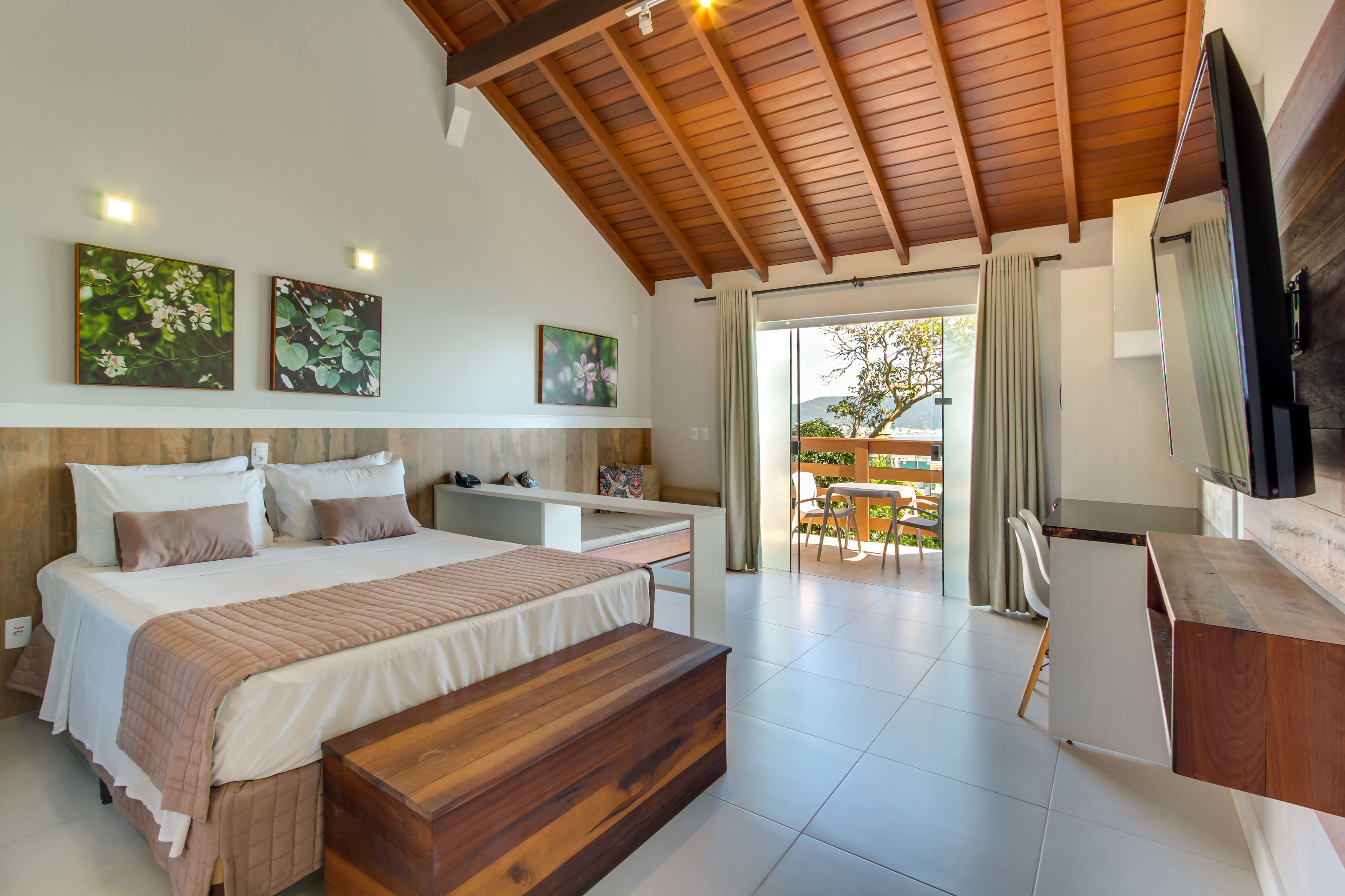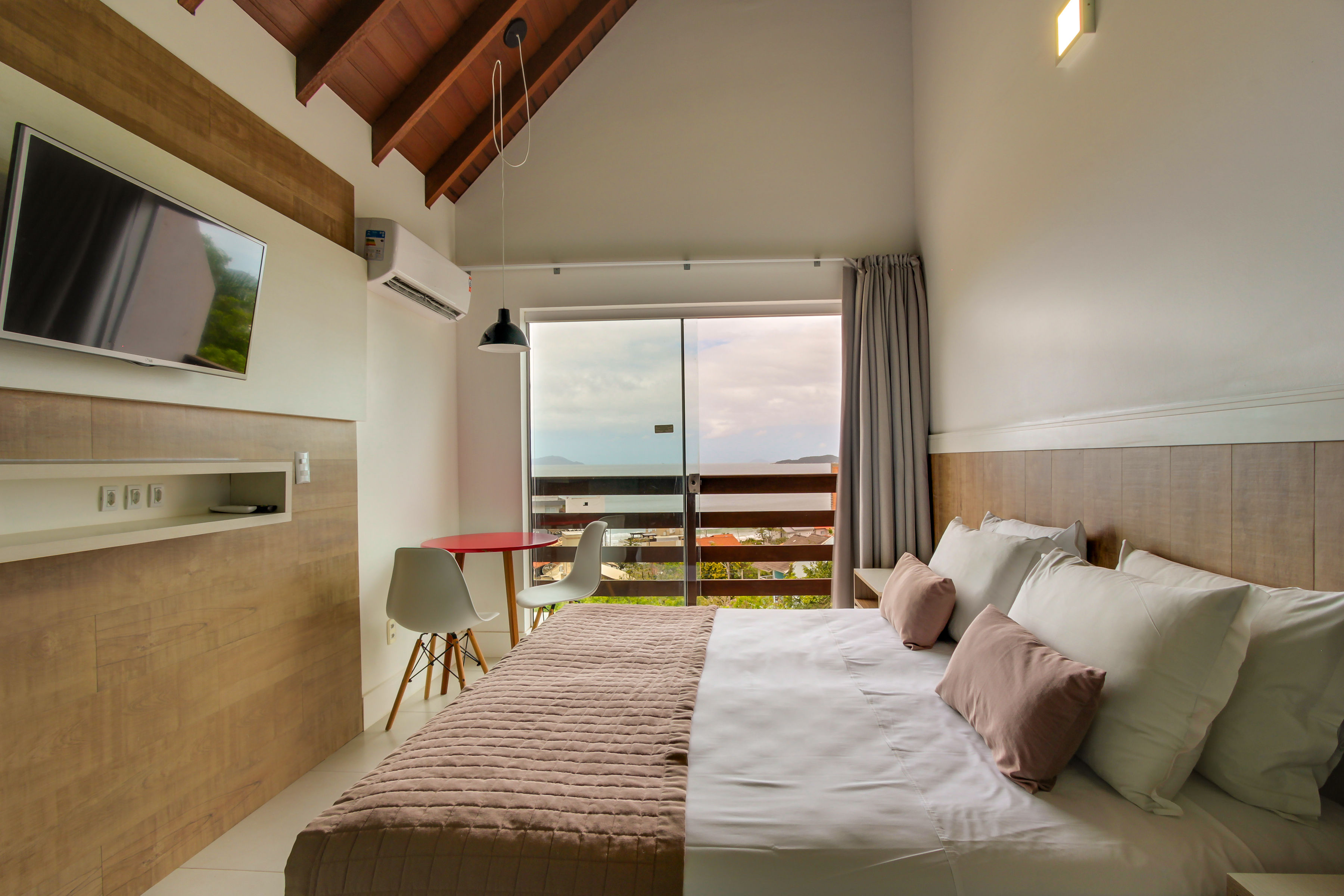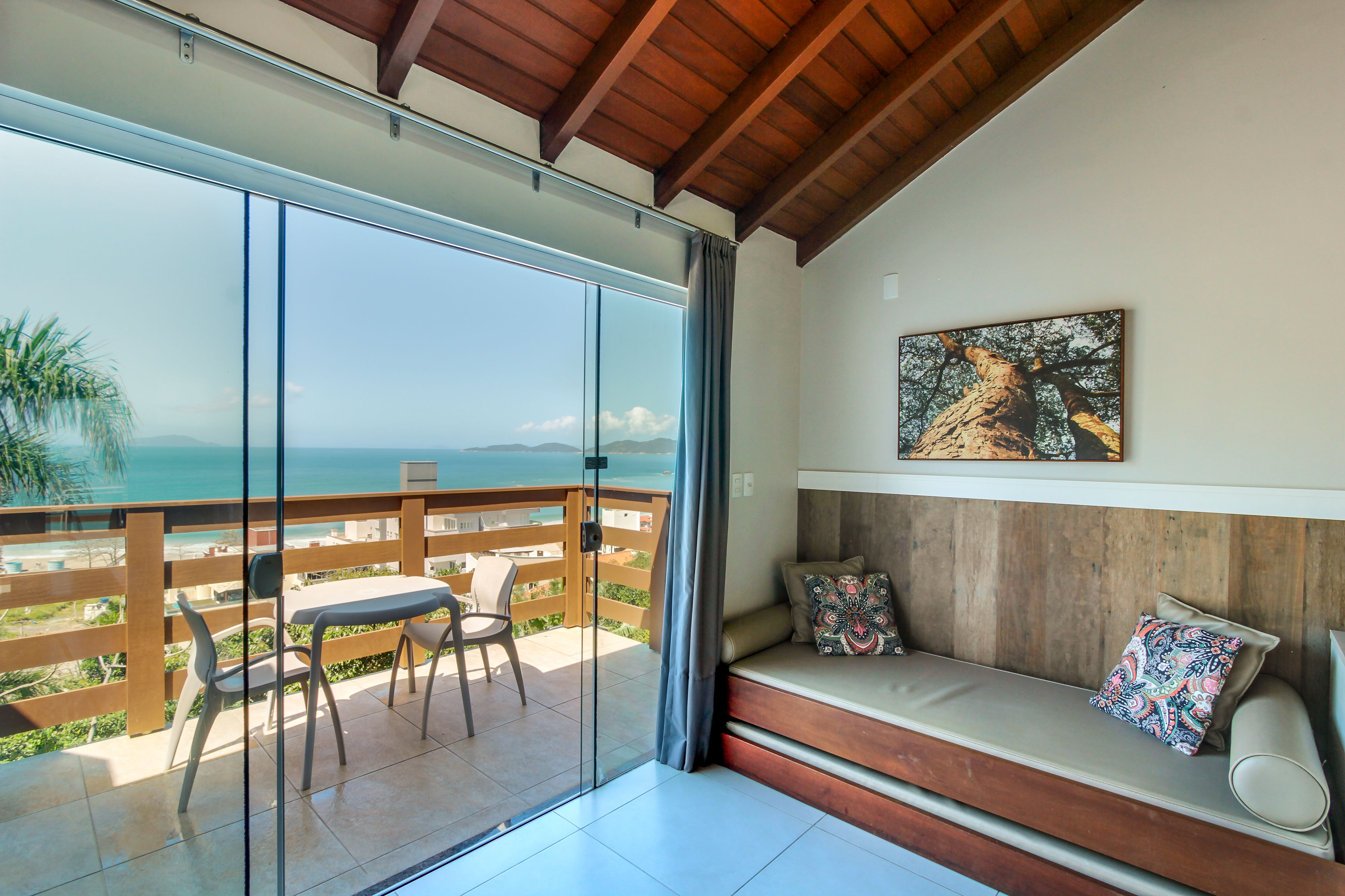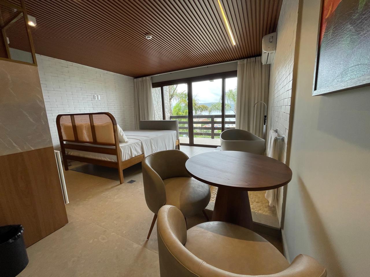 A Suíte está disponível no 1º ou 2º andar, oferecendo uma deslumbrante vista para a Praia de Bombinhas ou para 4 Ilhas.
