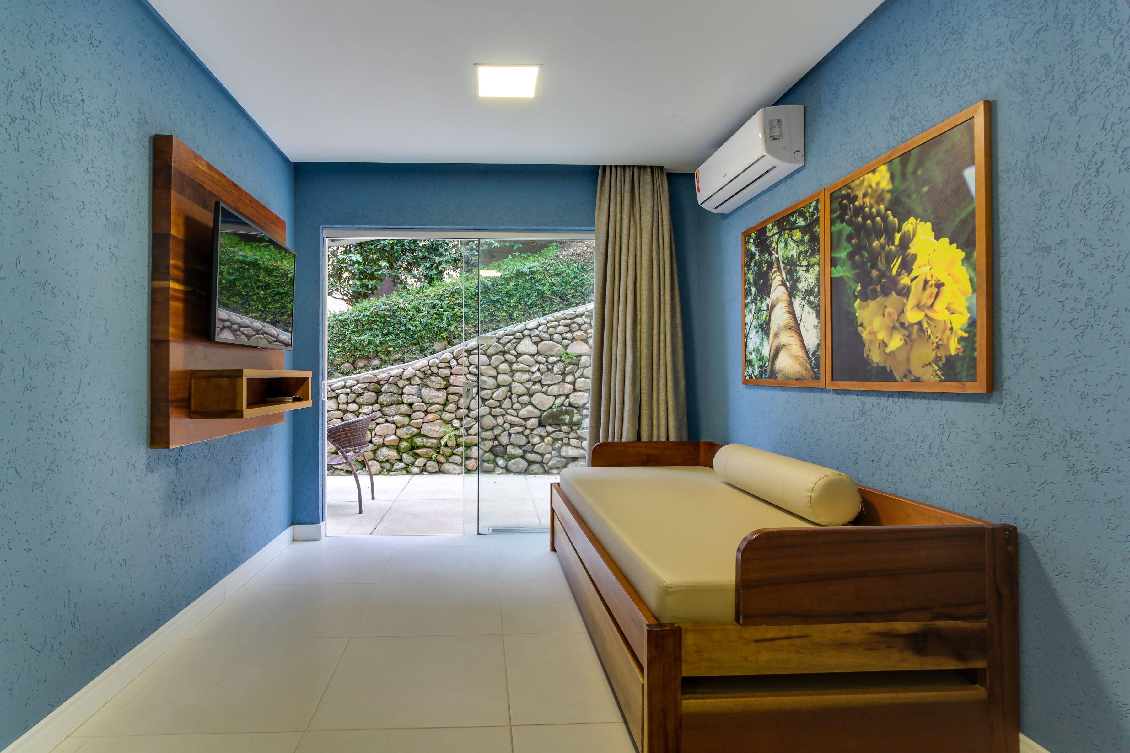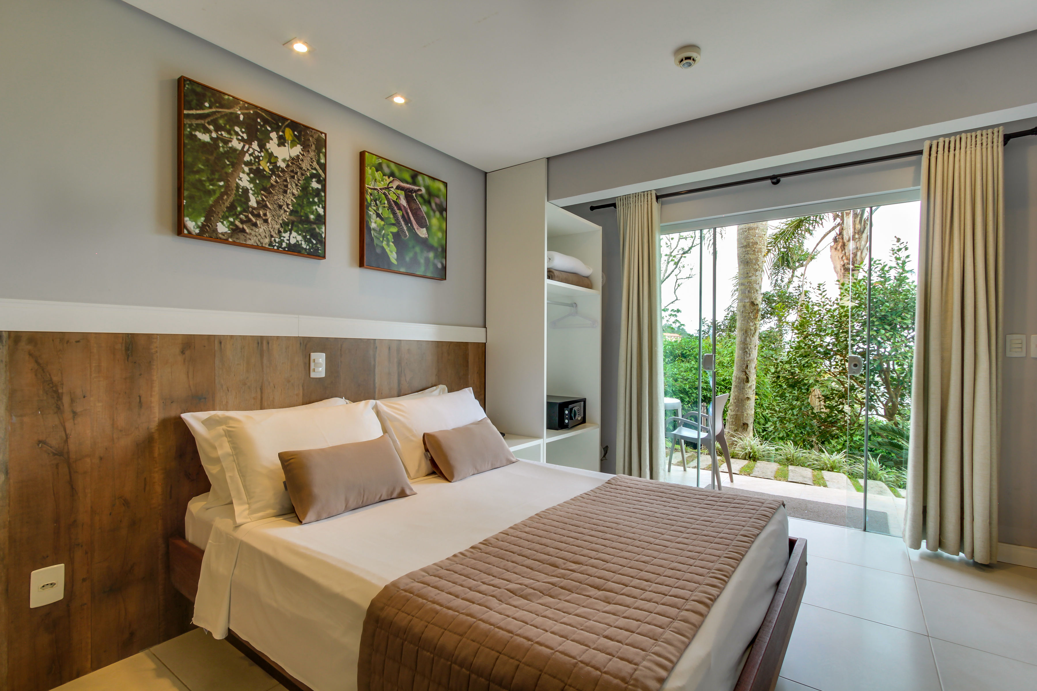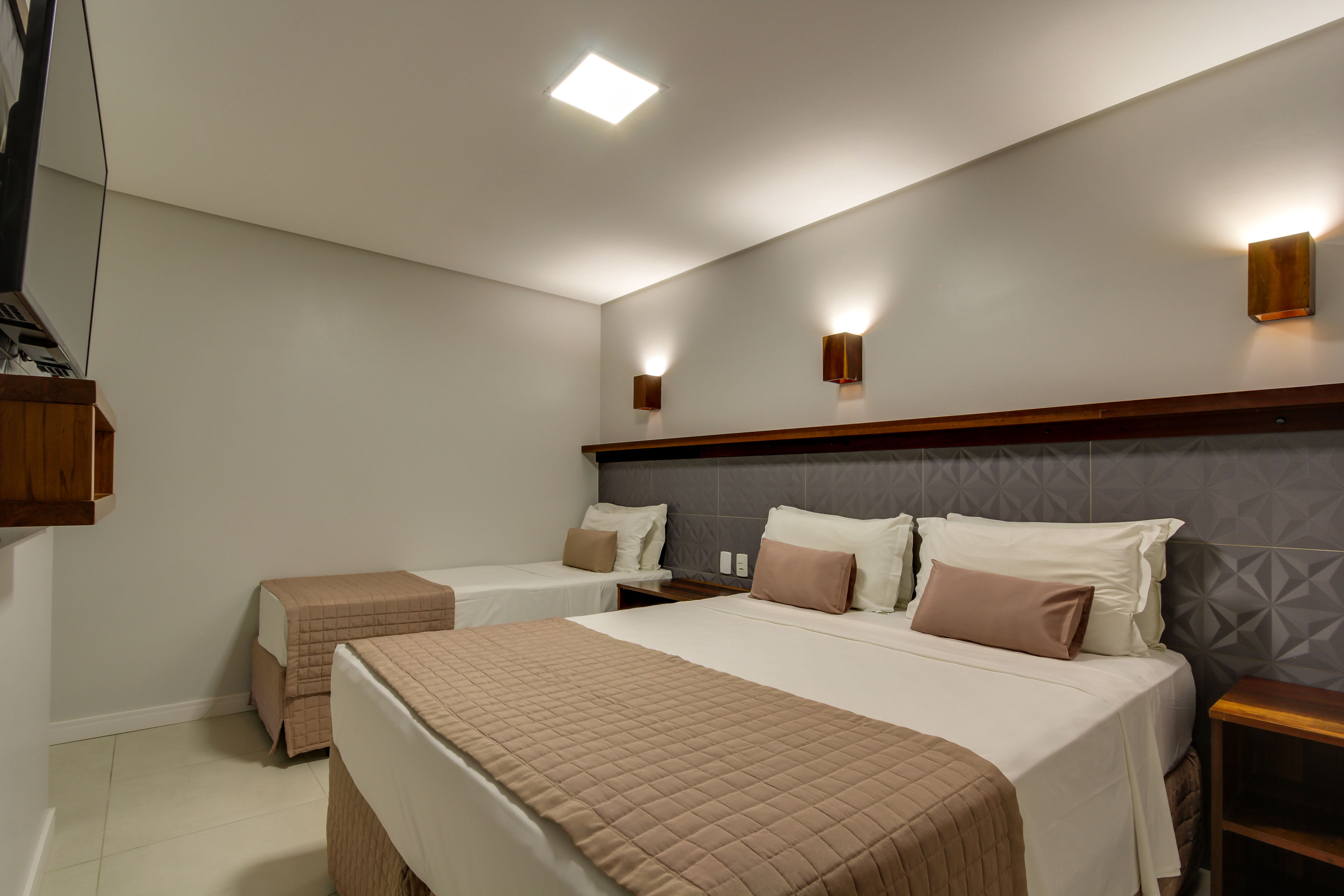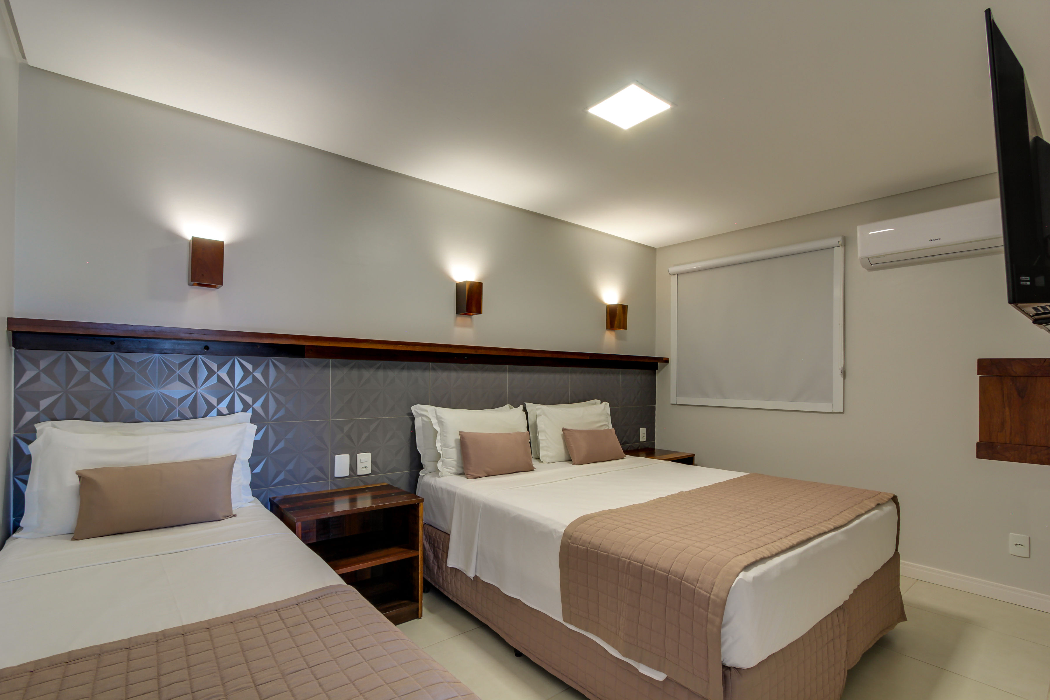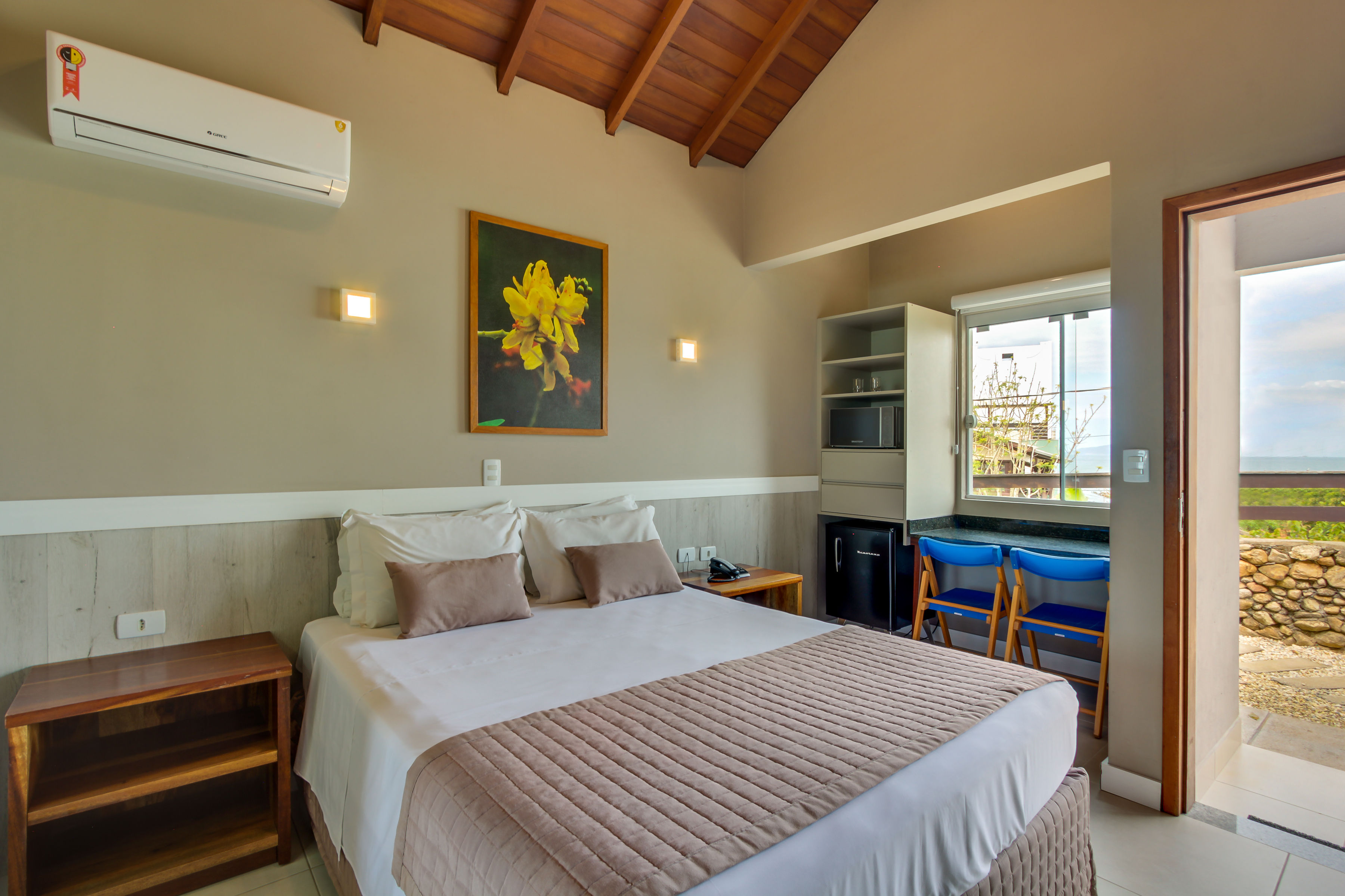Quarto mono ambiente com 28m² equipado com uma cama de casal e uma cama solteiro (reversíveis para três camas solteiro), TV 32” com canais a cabo, ar-condicionado Split quente/frio, telefone, cofre digital, frigobar, micro-ondas, banheiro c/ ducha a gás e secador de cabelo, varanda térrea com vista para estacionamento.