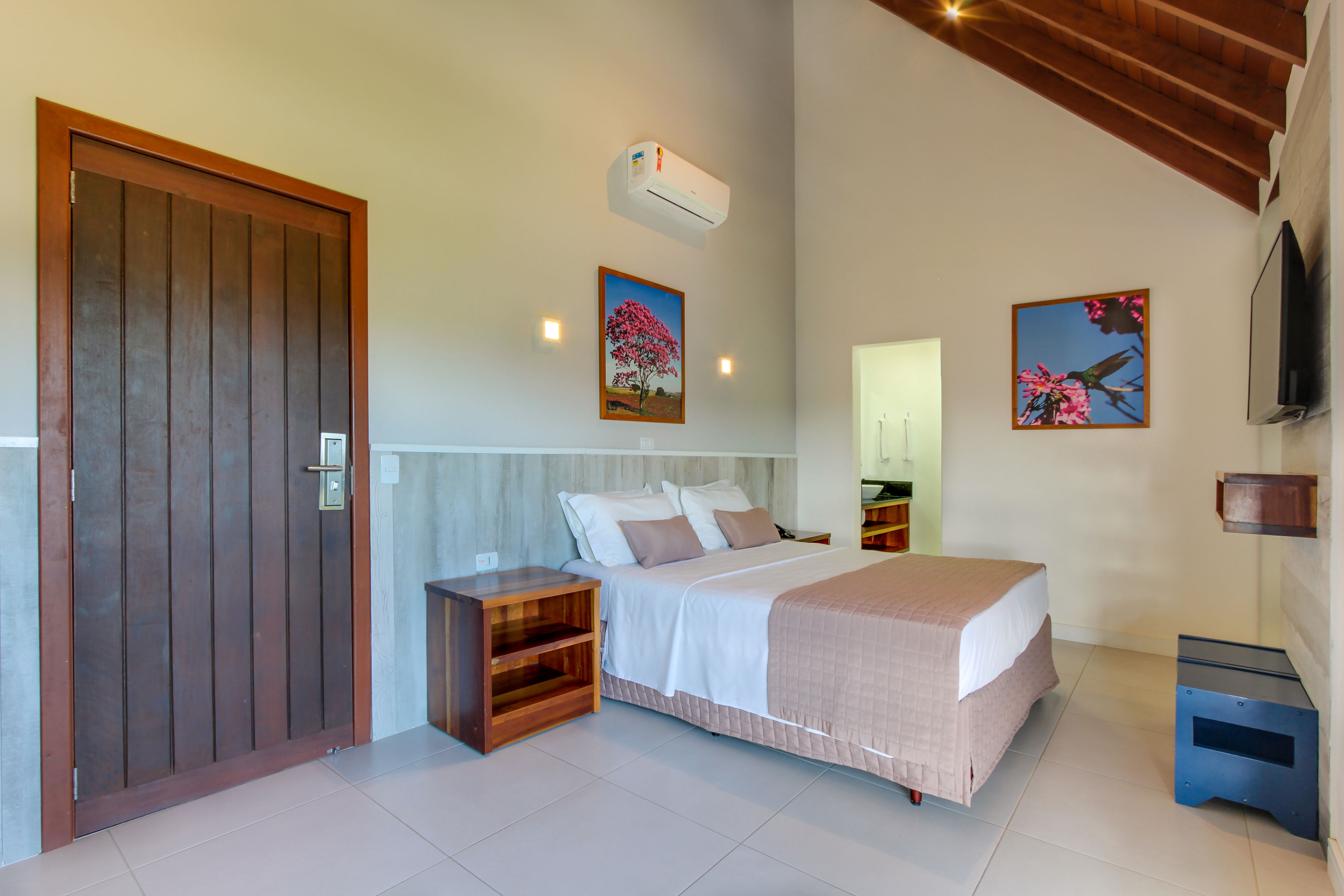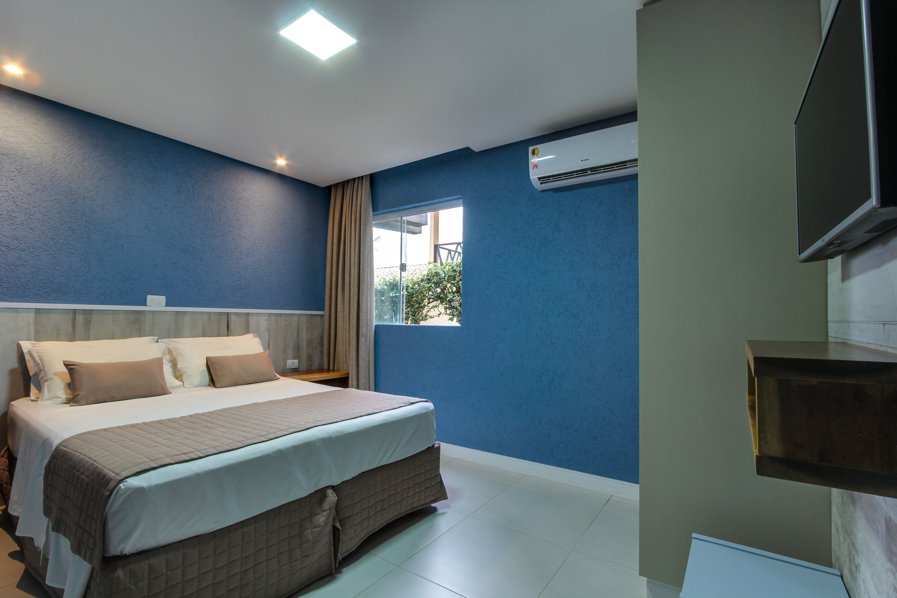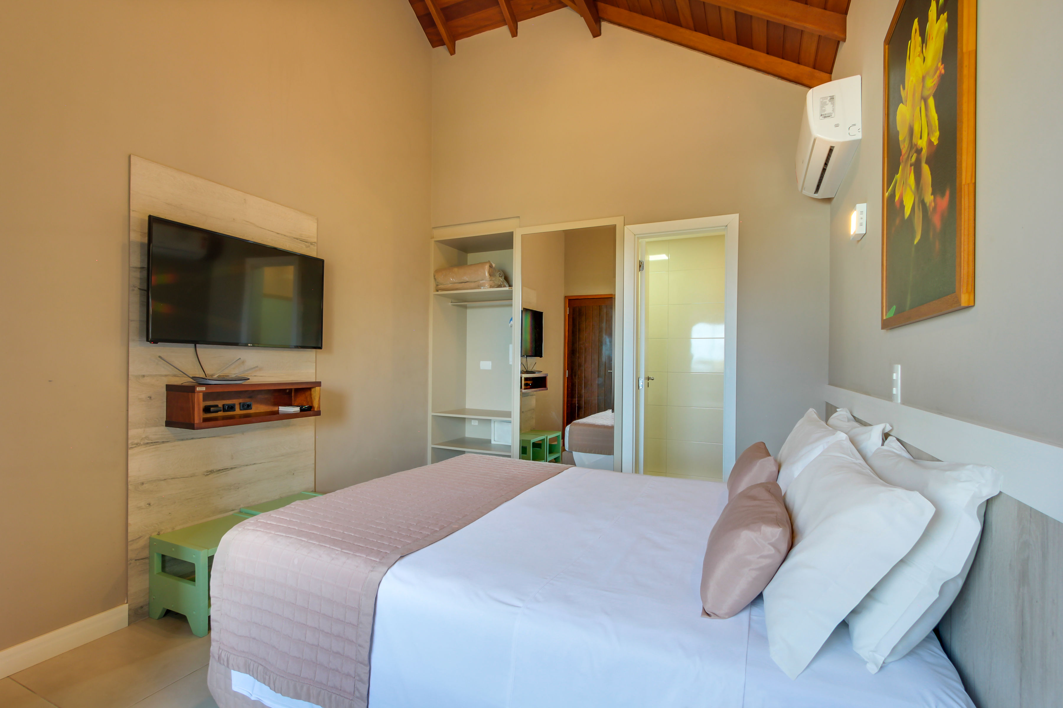Quarto com 12m² equipado com cama de casal, TV 32”, ar-condicionado Split quente/frio, telefone, cofre, frigobar, micro-ondas, bancada para refeições, banheiro c/ ducha a gás e secador de cabelo. Acomoda 2 pessoas em cama casal (unidade não acomoda crianças).