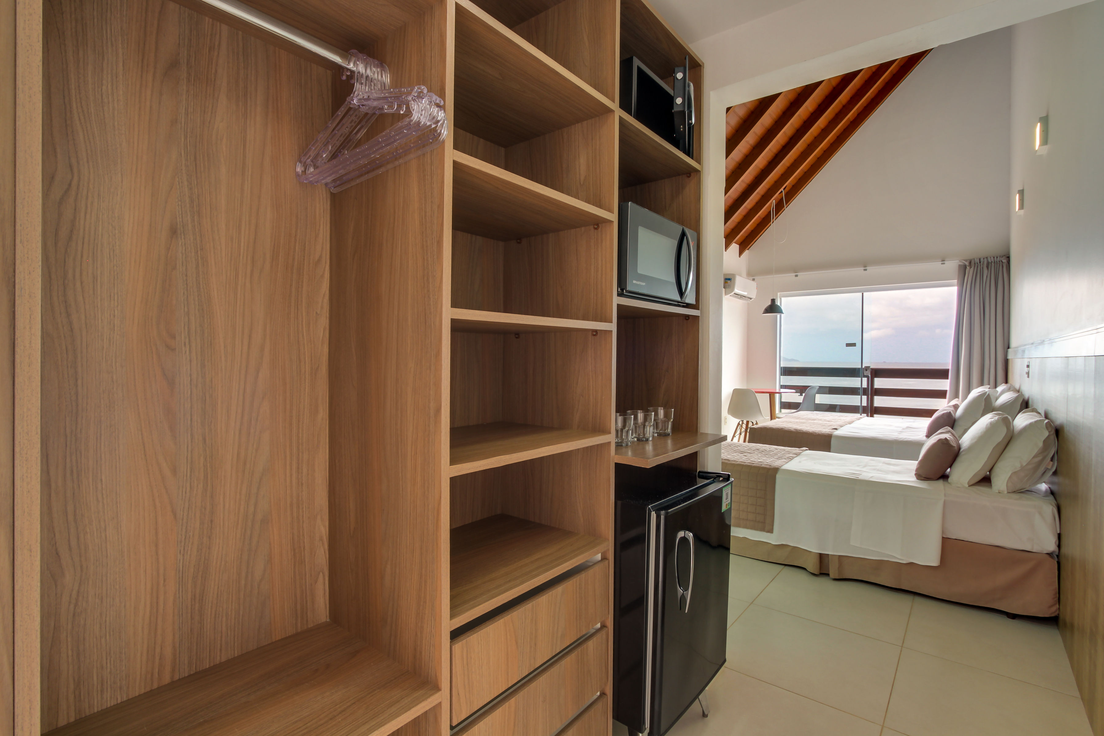 Quarto com 28m² monoambiente equipado com uma cama de casal e uma cama solteiro (reversíveis para três camas solteiro), TV 32”, ar-condicionado Split quente/frio, telefone, cofre digital, frigobar, micro-ondas, banheiro c/ ducha a -gás e secador de cabelo, sacada com vista para o mar.