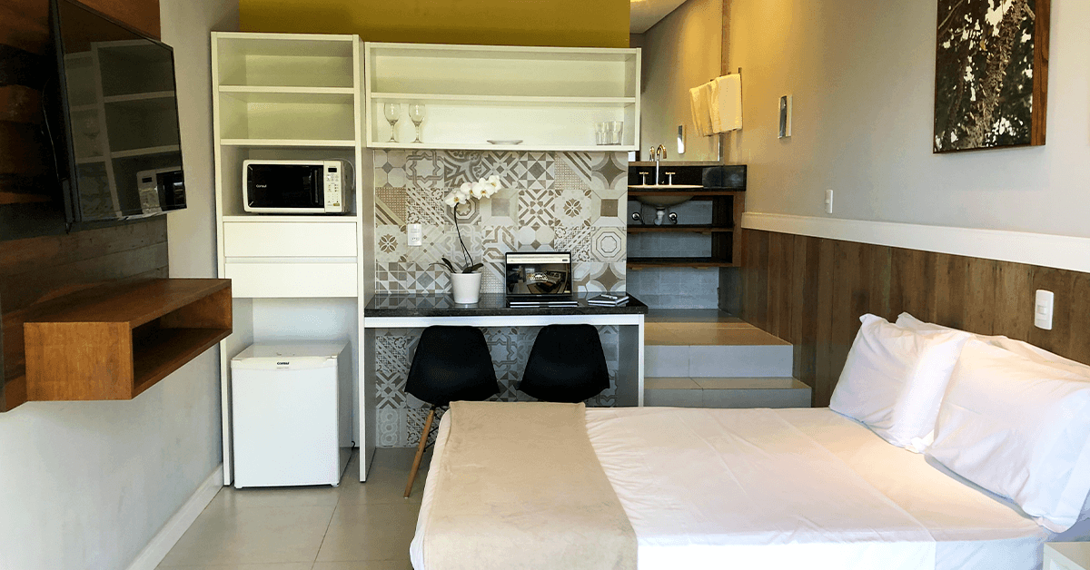 Aqui você encontra opções de suítes com vista para o mar, apartamentos família, cabanas e opções com sala. Todas as opções contam com TV, ar-condicionado, telefone, cofre, frigobar, micro-ondas, bancada para refeições e banheiro com ducha a gás e secador de cabelos.